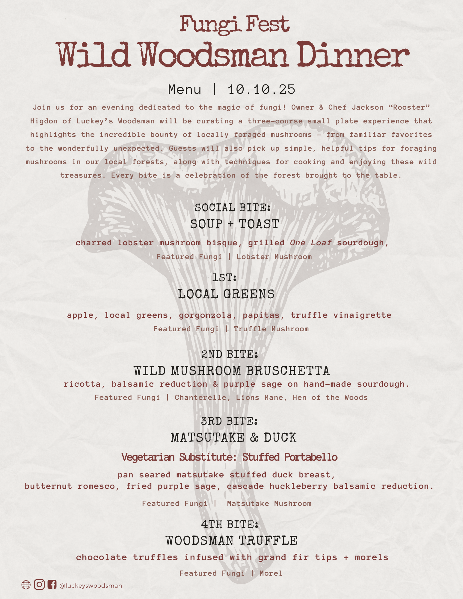Owner & Chef Jackson “Rooster” Higdon of Luckey’s Woodsman will be curating a five-course small plate experience that highlights the incredible bounty of locally foraged mushrooms – from familiar favorites to the wonderfully unexpected. Guests will also pick up simple, helpful tips for foraging mushrooms in our local forests, along with techniques for cooking and enjoying these wild treasures. Every bite is a celebration of the forest brought to the table.